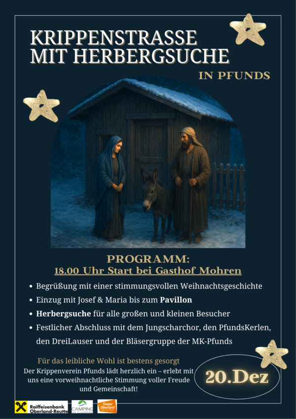 Der Krippenverein Pfunds laden zur jährlichen Krippenausstellung der gebauten Krippen ein - dieses Jahr wieder großaufgezogen bei der "Pfundser Krippenstraße". Eine besinnliche Herbergssuche durch die Pfundser Krippenstraße unter dem Motto „auf zum Krippa schauga“. Große Krippenausstellung im traditionellen aber auch im orientalischen Stil, weihnachtliche Stimmung, viel musikalische Unterhaltung, Krippenspiel, Glühwein, Punsch,…