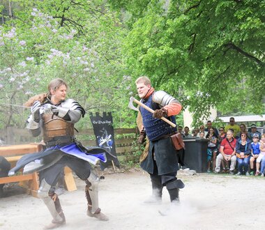 Exciting knight duels, spectacular fire shows and the medieval music of the group Heydenrausch bring the past times to life.
