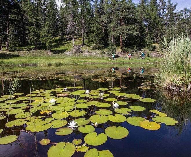 Start dieser fahrtechnisch wie konditionell sehr einfachen Tour ist bei der Bergstation der Mutzkopf Sesselbahn auf rund 1.800 m. Sie führt auf Schotter über den Schwarzsee zum Riatschhof und endet nach knapp einer Stunde bei der Talstation der Mutzkopfbahn. Herrliche Blicke auf die Nauderer und Engadiner Berge begleiten auf der 10 Kilometer langen Runde und auf der Sonnenterasse des Riatschhofs bei Tiroler Köstlichkeiten, Kaffee, Kuchen oder einem Eis an heißen Sommertagen lassen sich weitere Bike-Abenteuer entspannt planen. Die Abfahrt zur Talstation und somit dem Ende der Tour ist auf dem asphaltierten Fahrweg oder einem der anfänger- und familienfreundlichen (Enduro-)Trails möglich.